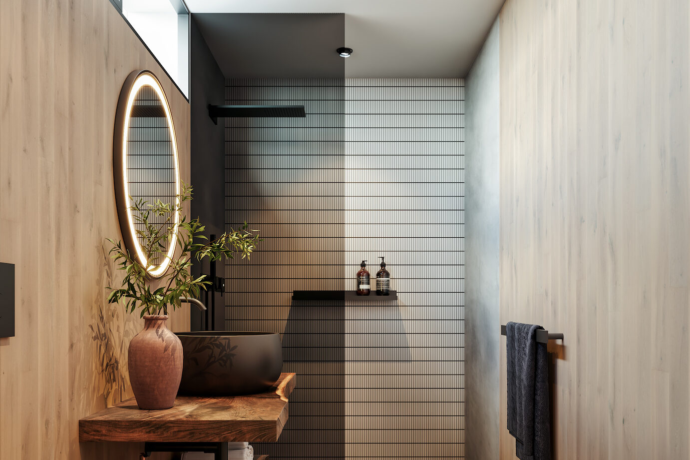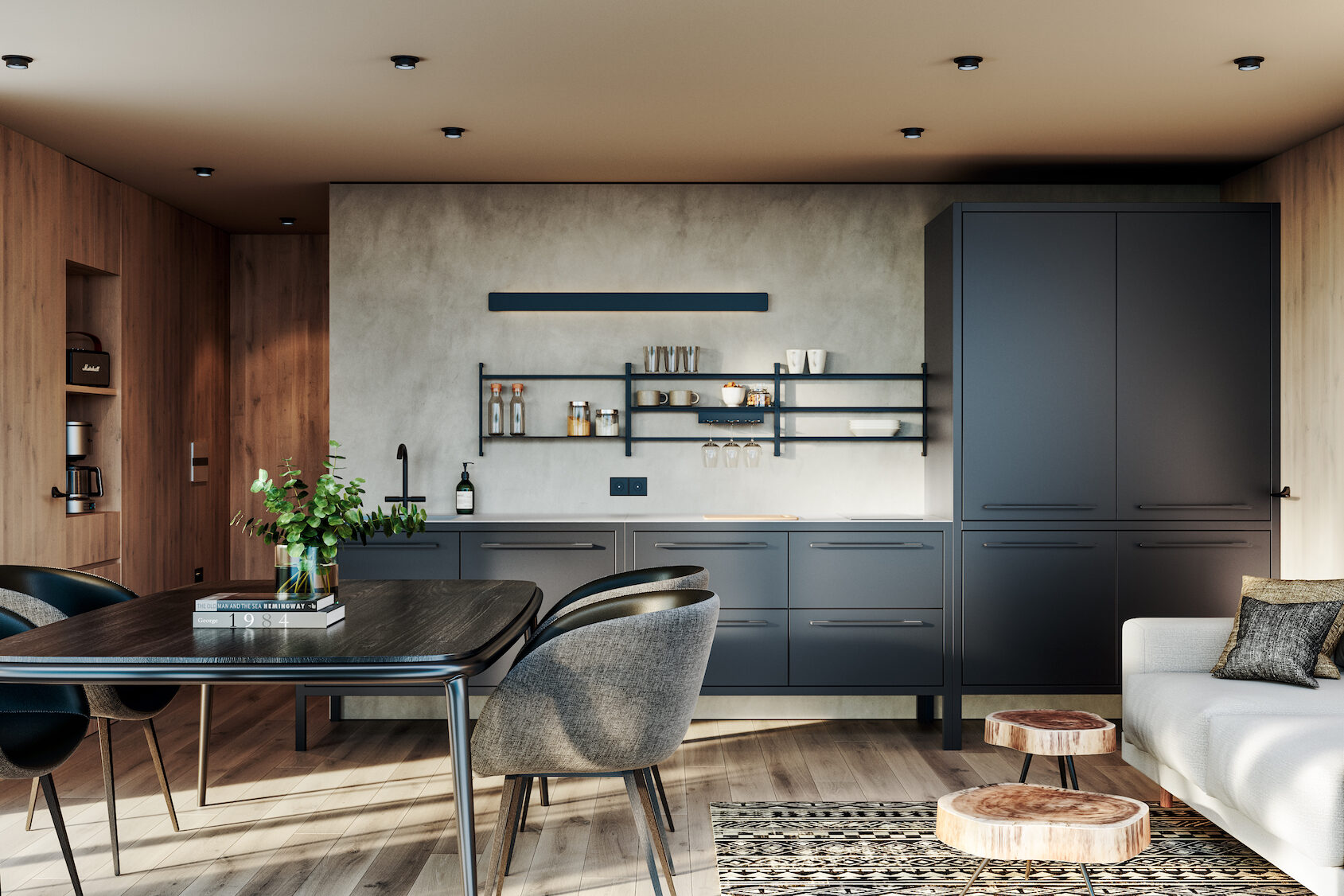 The interiors of the house feature minimalist furnishing combined with a