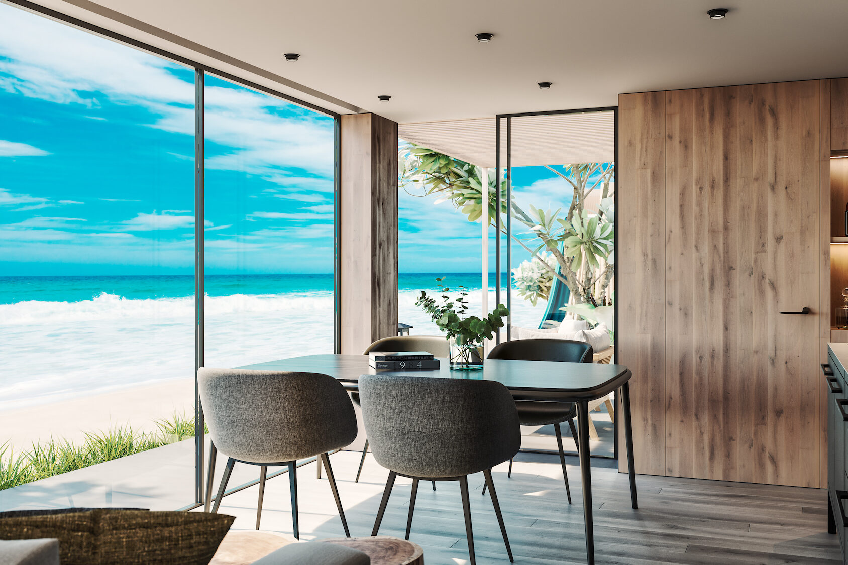 The living area has been created in an open-concept style with a spacious kitchen, dining, and living space, where families can enjoy quality time, surrounded by floor-to-ceiling windows that offer views of the white sand and vibrant blue sea.